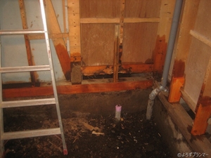 案の定断熱材は薄く、骨組みはボロボロのスカスカでした。特に土台となる角材がシロアリが食べ尽くしたカスばかりで、しかも湿気によってケチョケチョの濡れたスポンジ状態でした。